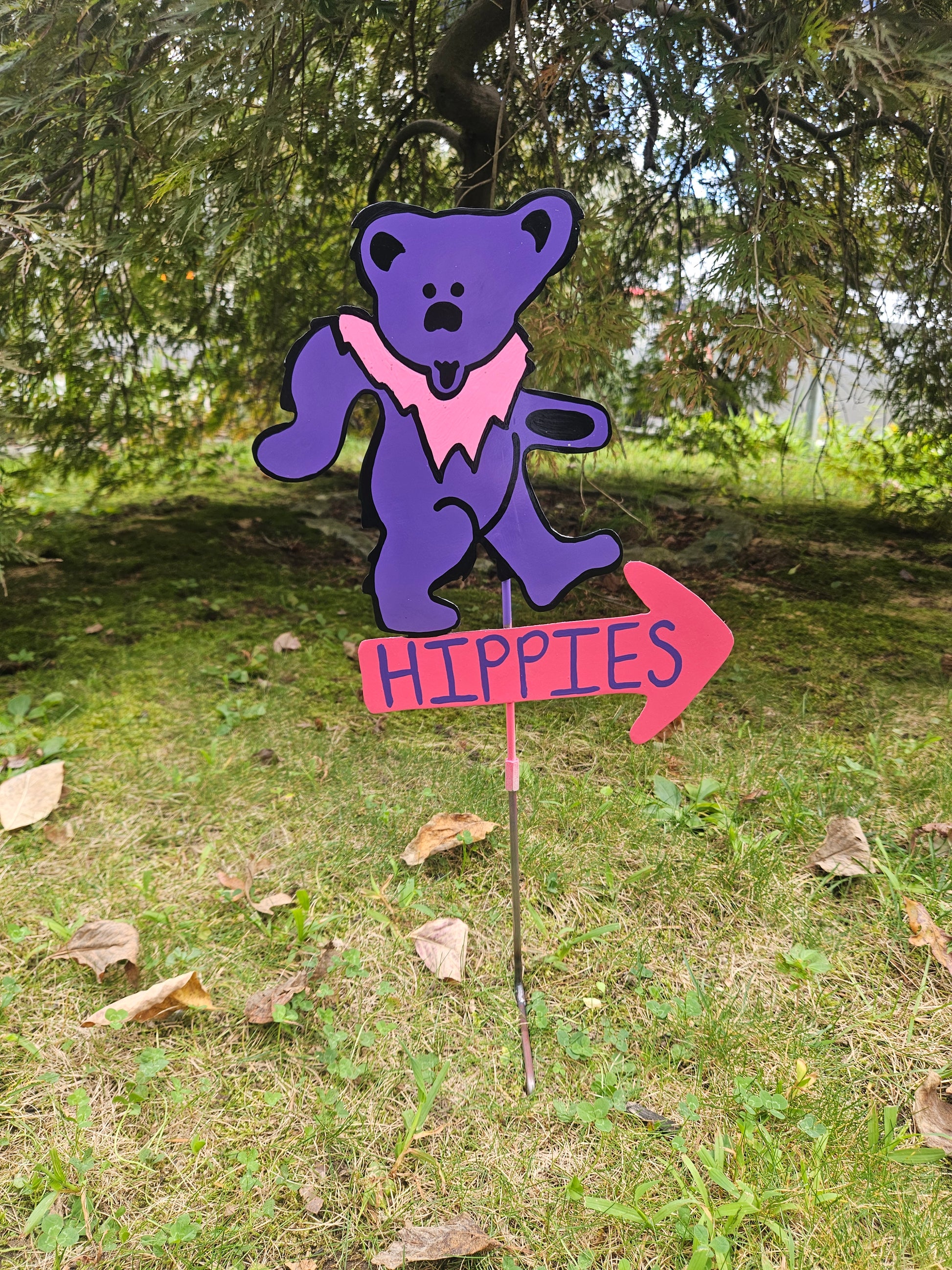 Grateful Dancing Bear but with a twist! This bear is dancing on an arrow with your choice of it saying "HIPPIES" or "DEAD HEADS" to give your yard a groovy touch!