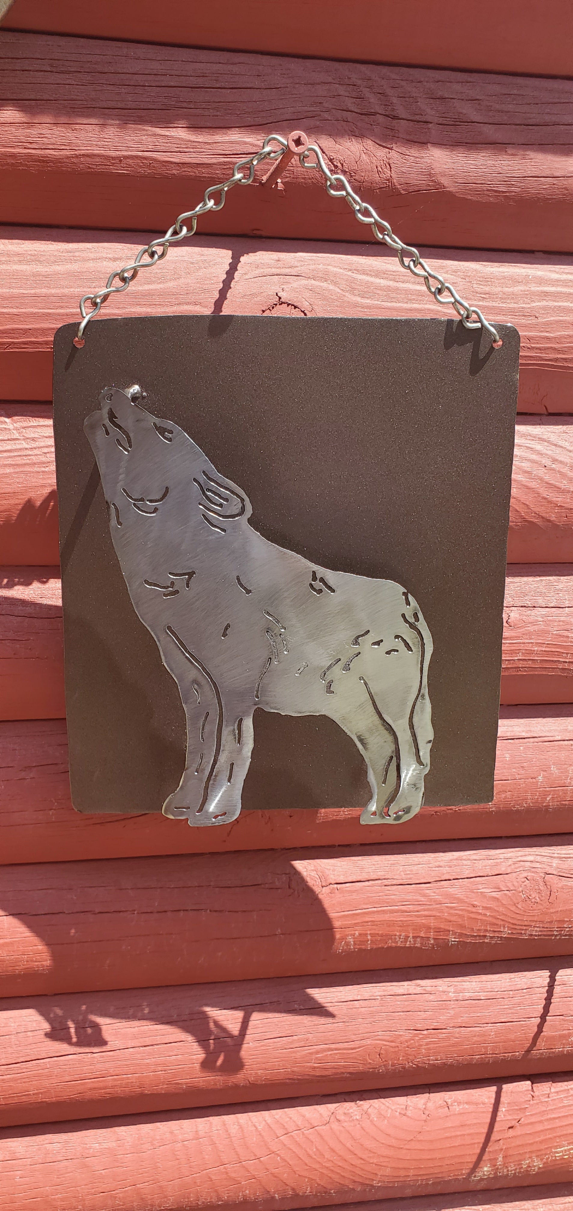 This simple but bold wolf is 3-D raised above a metal canvas painted black, made to stand out. This is a perfect conversation starter or a perfect finishing touch to a nursery.