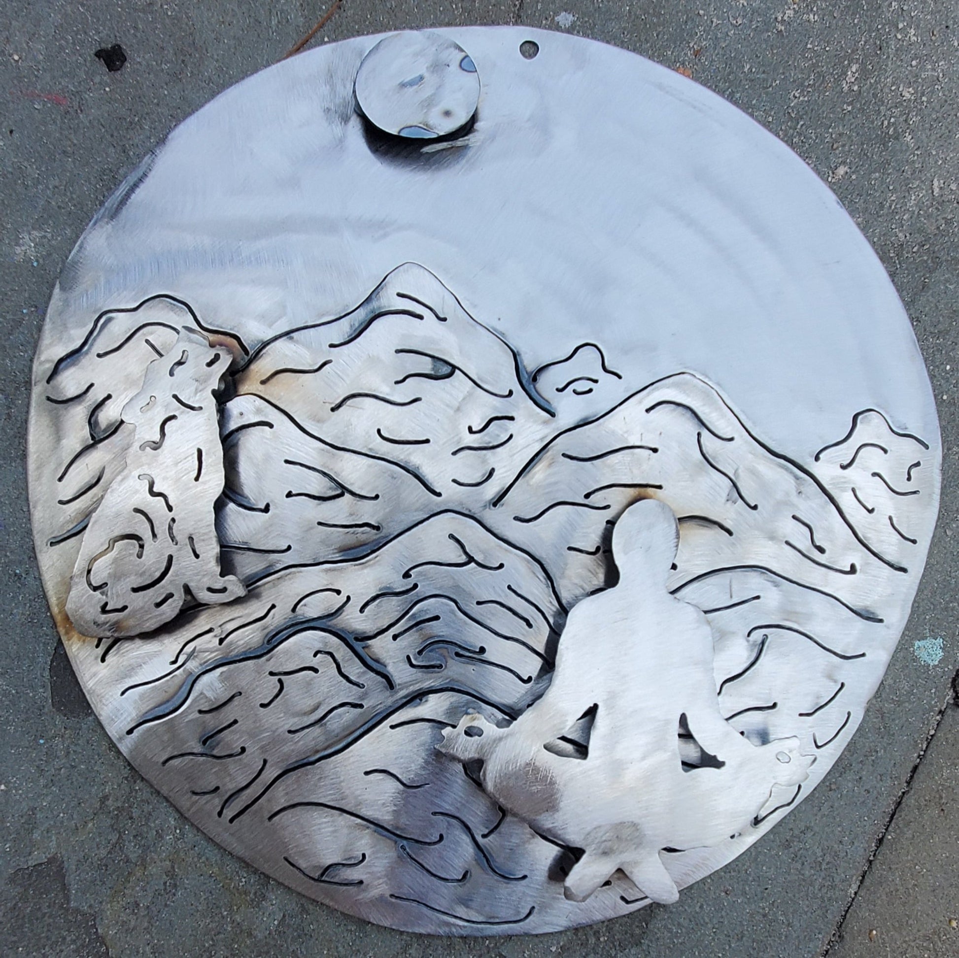 Each mountianscape is cut out by hand with a plasma cutter and each piece, the moon, wolf and yogi are all carefully welded on.